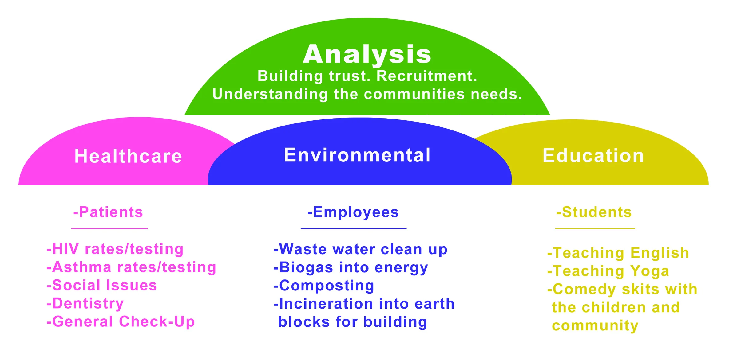 - We will be collaborating with the local clinic, Manna Project, to help promote their clinic and many services. Such collaboration will include fundraising, searching for needed supplies, helping with the expansion of the clinic and healthy lifestyle campaigning in the community.